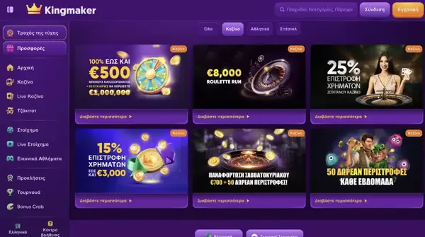 Το interface είναι σχεδιασμένο για καθαρή πλοήγηση σε κινητό, με ξεκάθαρη ροή δελτίου και γρήγορη εναλλαγή μεταξύ αθλητικών και καζίνο με το ίδιο πορτοφόλι. Αν διεκδικήσεις μια αθλητική προσφορά, οι όροι του μπόνους εμφανίζονται πριν επιβεβαιώσεις. Οι προωθήσεις αθλητικών και καζίνο τρέχουν παράλληλα, ώστε να διαχειρίζεσαι και τα δύο χωρίς να αλλάζεις λογαριασμούς. Αυτή η κοινή πρόσβαση είναι μέρος του τρόπου με τον οποίο το Kingmaker Casino διατηρεί την εμπειρία συνολικά συνεπή.