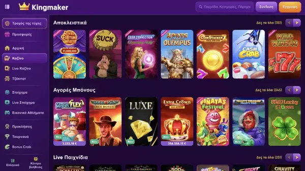 Το λόμπι του καζίνο μας βασίζεται σε γρήγορα φίλτρα, ώστε να περιηγείσαι ανά κατηγορία, πάροχο και χαρακτηριστικά όπως τζακπότ ή bonus buys. Θα βρεις θεματολογίες από περιπέτεια και φαντασία έως κλασικά φρουτάκια με φρούτα, καθώς και εποχιακές κυκλοφορίες και τίτλους τύπου branded από μεγάλα studios. Τα παιχνίδια είναι βελτιστοποιημένα για παιχνίδι σε browser σε desktop, κινητό και tablet, και το υπόλοιπό σου συγχρονίζεται σε όλες τις συσκευές. Δεν υπάρχει εφαρμογή Kingmaker για iOS ή Android αυτή τη στιγμή, οπότε απλώς συνδέεσαι και παίζεις μέσω browser.